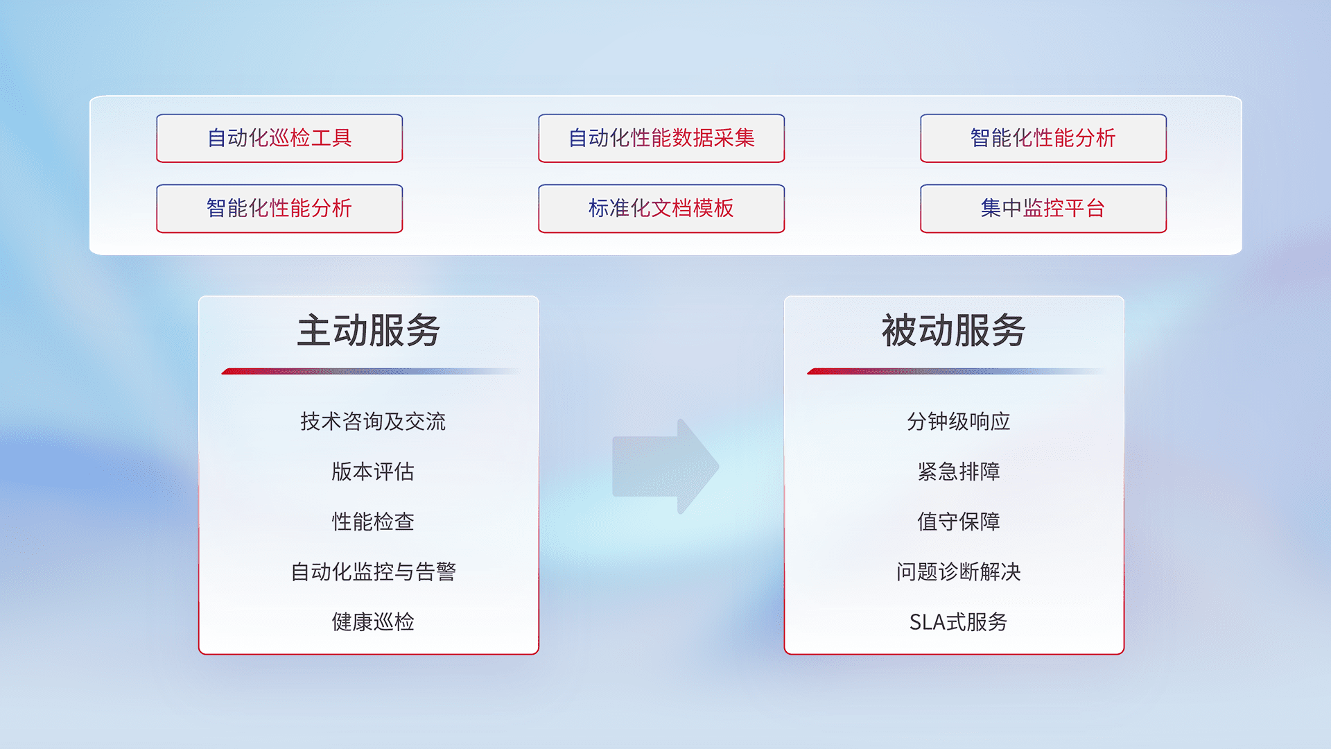 智能化工具和标准化文档,,,,保障服务质量,,,,提供主动服务(包含技术咨询、、版本评估、、、、性能检查、、自动化监控与告警、、、健康巡检)和被动服务包含(分钟级响应、、、紧急排障、、、、值守保障、、、、问题诊断解决、、、、SLA服务)。。